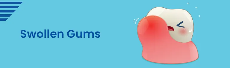 The common symptoms of swollen gums include redness, puffiness, tenderness, pain or discomfort, bleeding gums (especially during brushing or flossing), bad breath, receding gums, and the formation of pockets between the teeth and gums. In advanced stages, loose teeth and changes in the bite may also be observed.